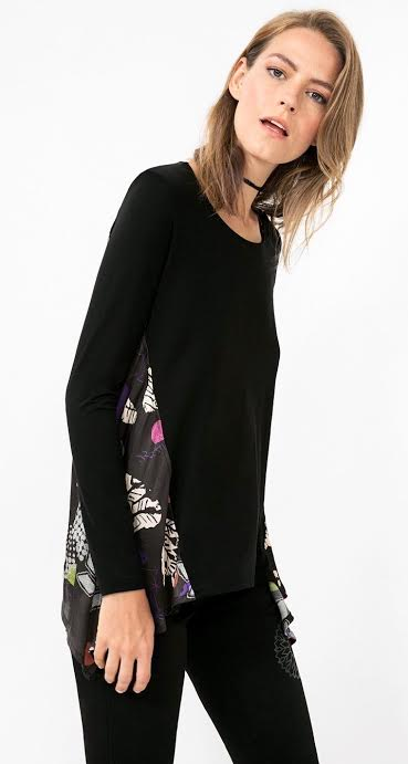 Camisola preta de manga comprida e corte largo, com um estampado outonal nas costas e as partes laterais assimétricas!