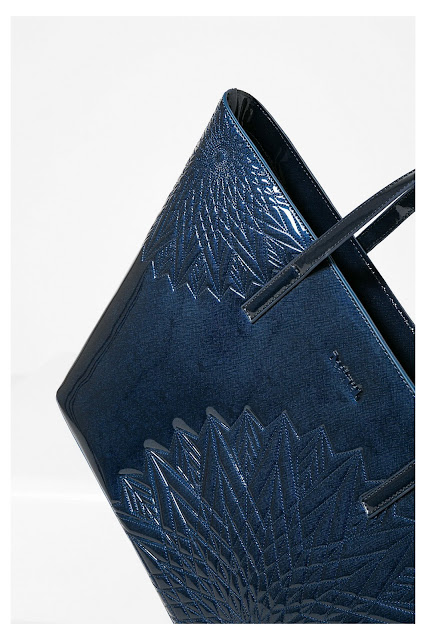 Mala tipo shopper azul, envernizada e com um detalhe de desenhos geométricos em 3D. É confortável e espaçosa.