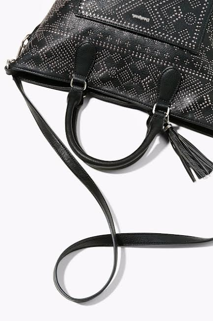 Mala preta tipo saco com tachas e alça removível.