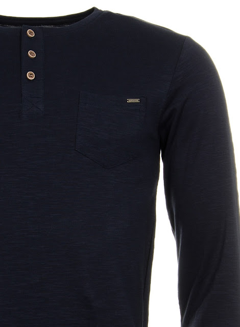 Camisola simples, azul escura, de manga comprida, com botões e um bolso.