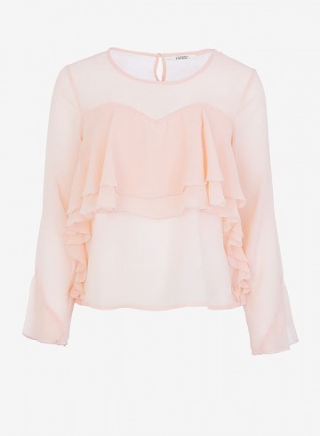 Blusa semitransparente, cor de salmão, com folhos. Perfeita para a primavera, com um casaco de malha.