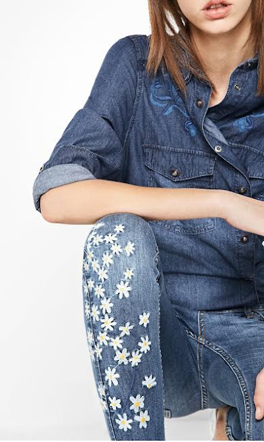 Jeans com efeito desbotado e bordados florais... DESIGUAL!